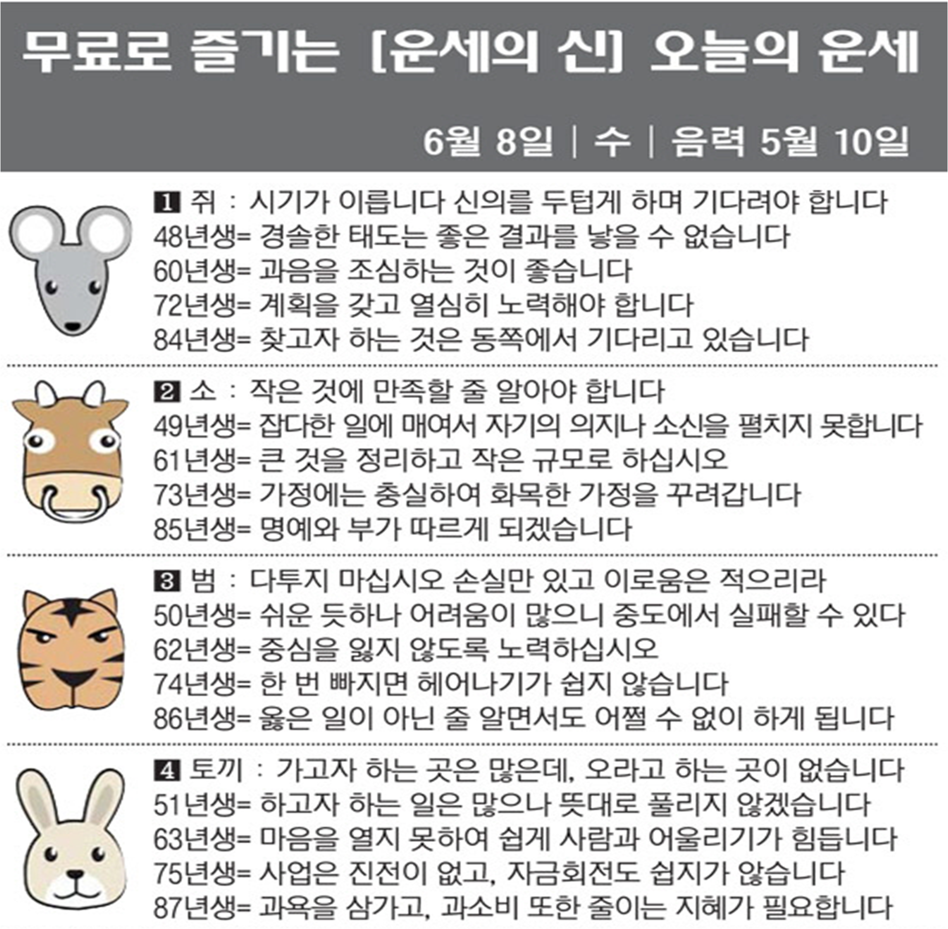 오늘의 운세 2022년 6월 8일 수요일 띠별운세 스포츠조선 2022. 6. 8. 08:45 #운세의신 에서만 무료로 제공하는 운세 모음!▼ 1. #연애궁합 - http://bit.ly/2HGcNGC 2. #오늘의운세 - http://bit.ly/2Kvo4ra 3. #운명의상대 - http://bit.ly/2xjt3ss 4. #평생사주 - http://bit.ly/2rg8WWv 5. #재물운 -http://bit.ly/2rdQz4A 6. #자녀운 - http://bit.ly/2krNsSx